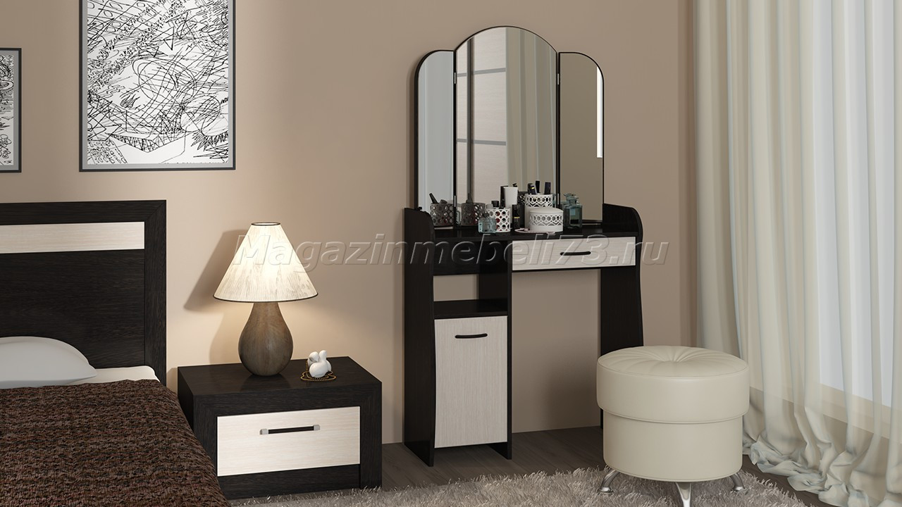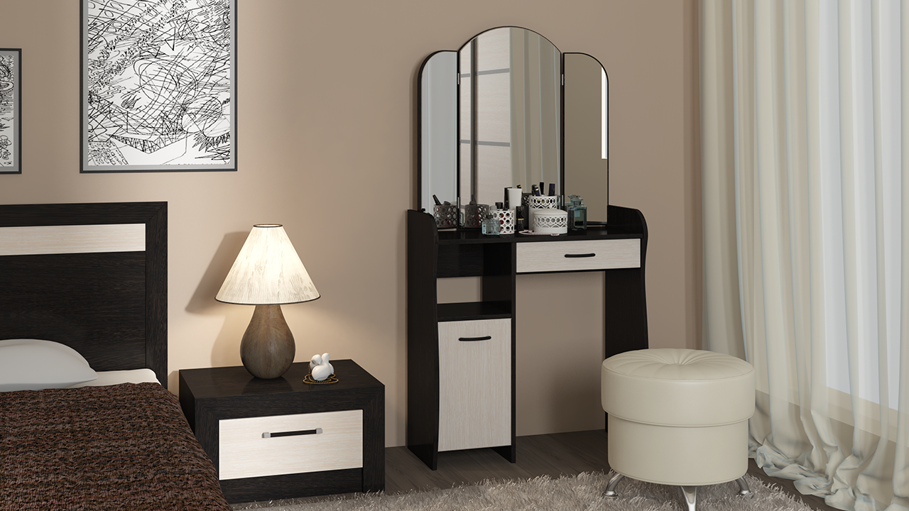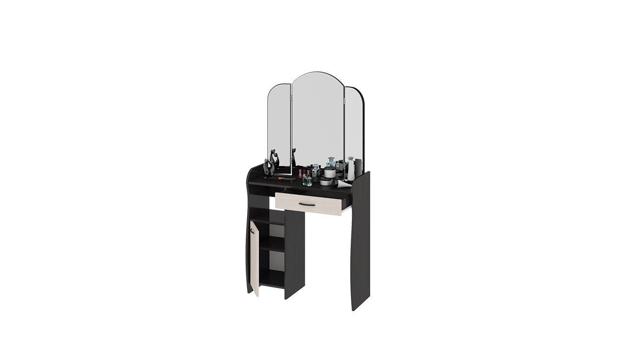 Лаконично простой и элегантный туалетный столик обладает не только эстетичным видом, но и достойной практичностью. Модель отличается эргономичной конструкцией и элегантной формой деталей. Вместительный ящик, столешница, большое зеркало и полки расположены на удобном уровне. Использование двух цветов в дизайне модели делает её оригинальной и позволяет использовать в любом интерьере.